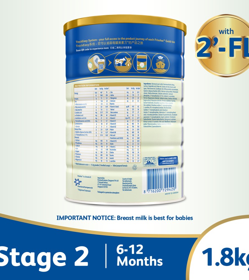 Introducing Frisolac Gold Stage 2, an infant milk powder formula for 6-12 months old’s. Frisolac Gold Stage 2 contains important nutrients to support overall growth and development. Frisolac uses LockNutriTM which is an advanced process technology that locks in milk protein structure in its natural form. Our infant formula is 100% produced and packed in the Netherlands. Frisolac is a global brand with presence in more than 20 countries worldwide.