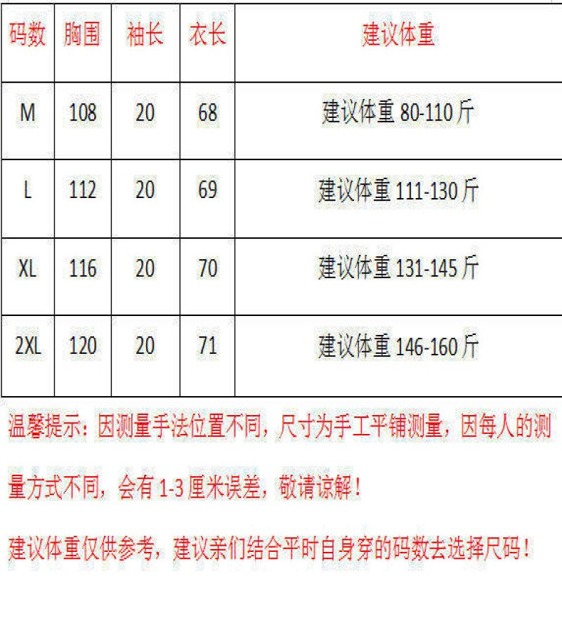 M: Length (68cm); Bust (108cm); Sleeve (20cm); Recommended Weight (40-55Kg);
