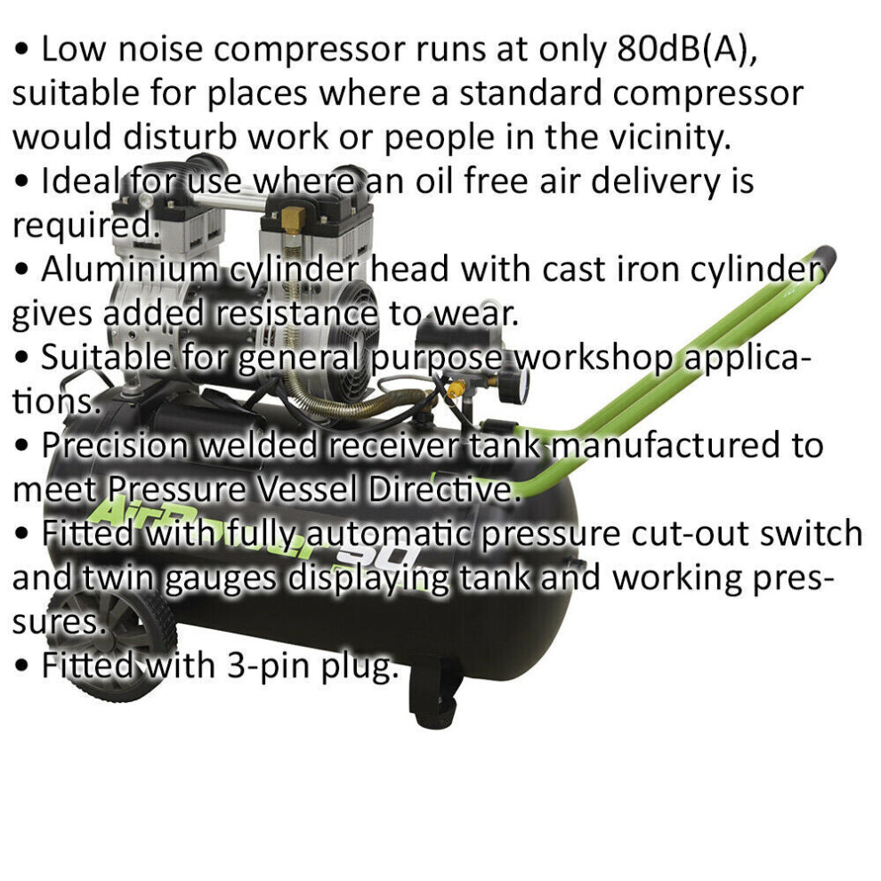 Low noise compressor runs at only 80dB(A), suitable for places where a standard compressor would disturb work or people in the vicinity. Ideal for use where an oil free air delivery is required. Aluminium cylinder head with cast iron cylinder gives added resistance to wear. Suitable for general purpose workshop applications.